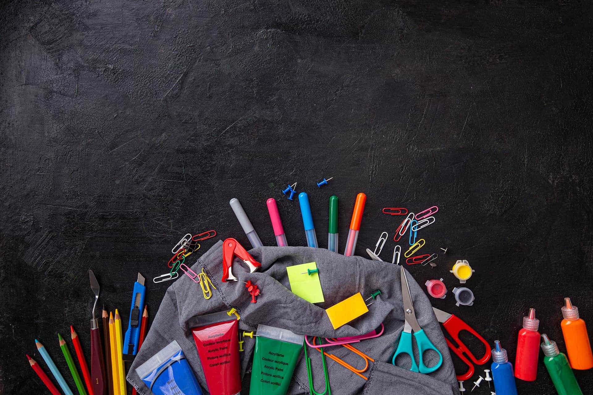 • Close Up View Of Various School Supplies On Colorful Surface